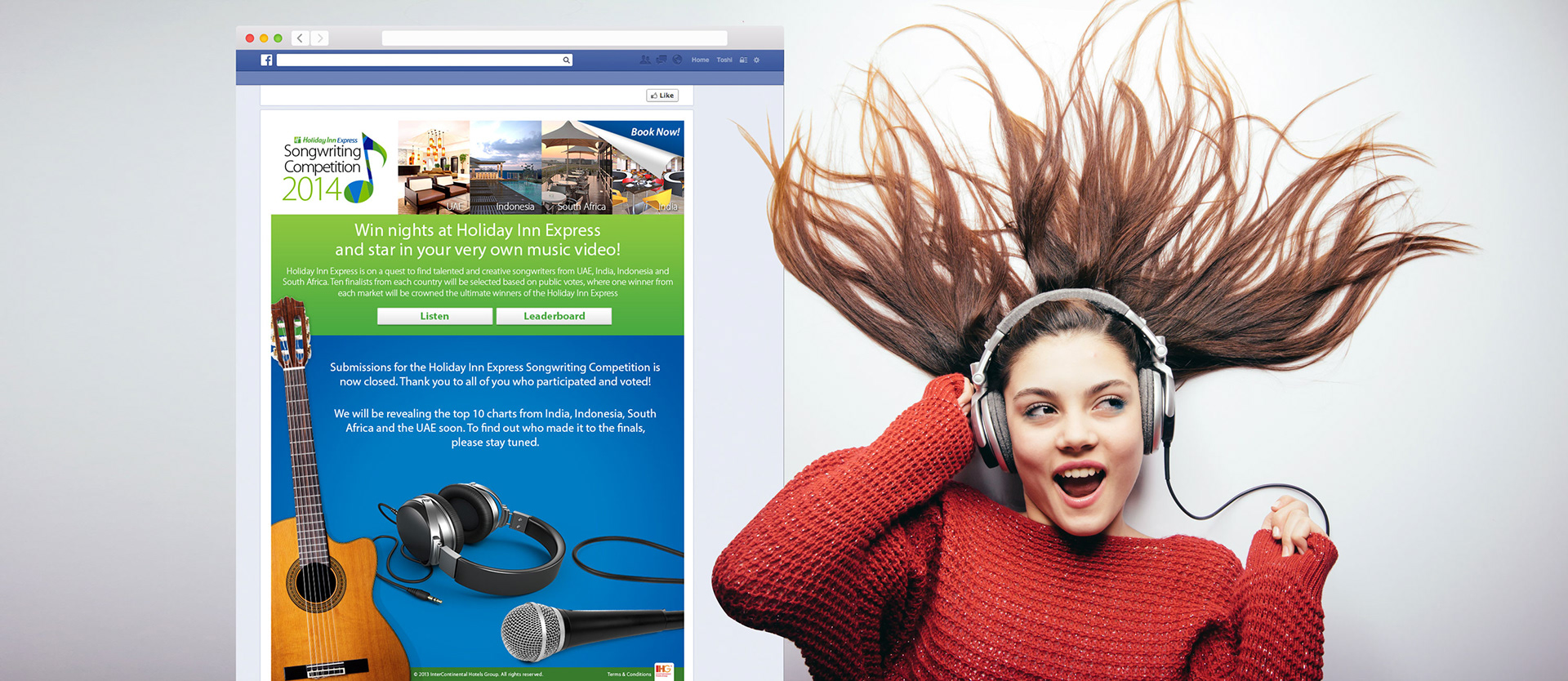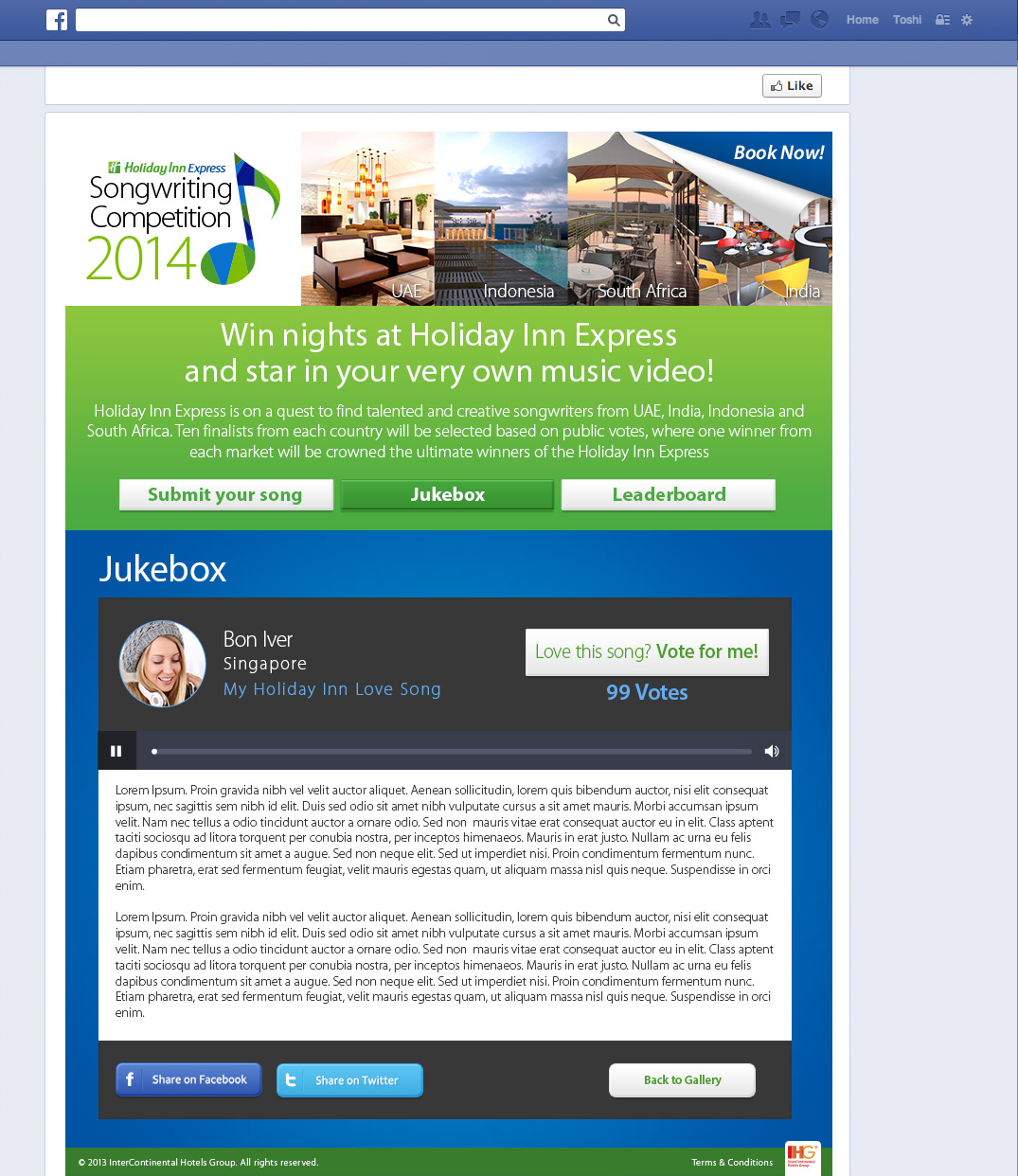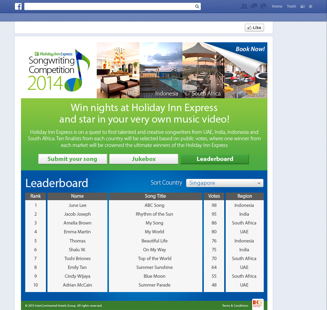 Holiday Inn launched a Songwriting Competition on Facebook. Design and development was carried out, including posting, voting and jukebox features.